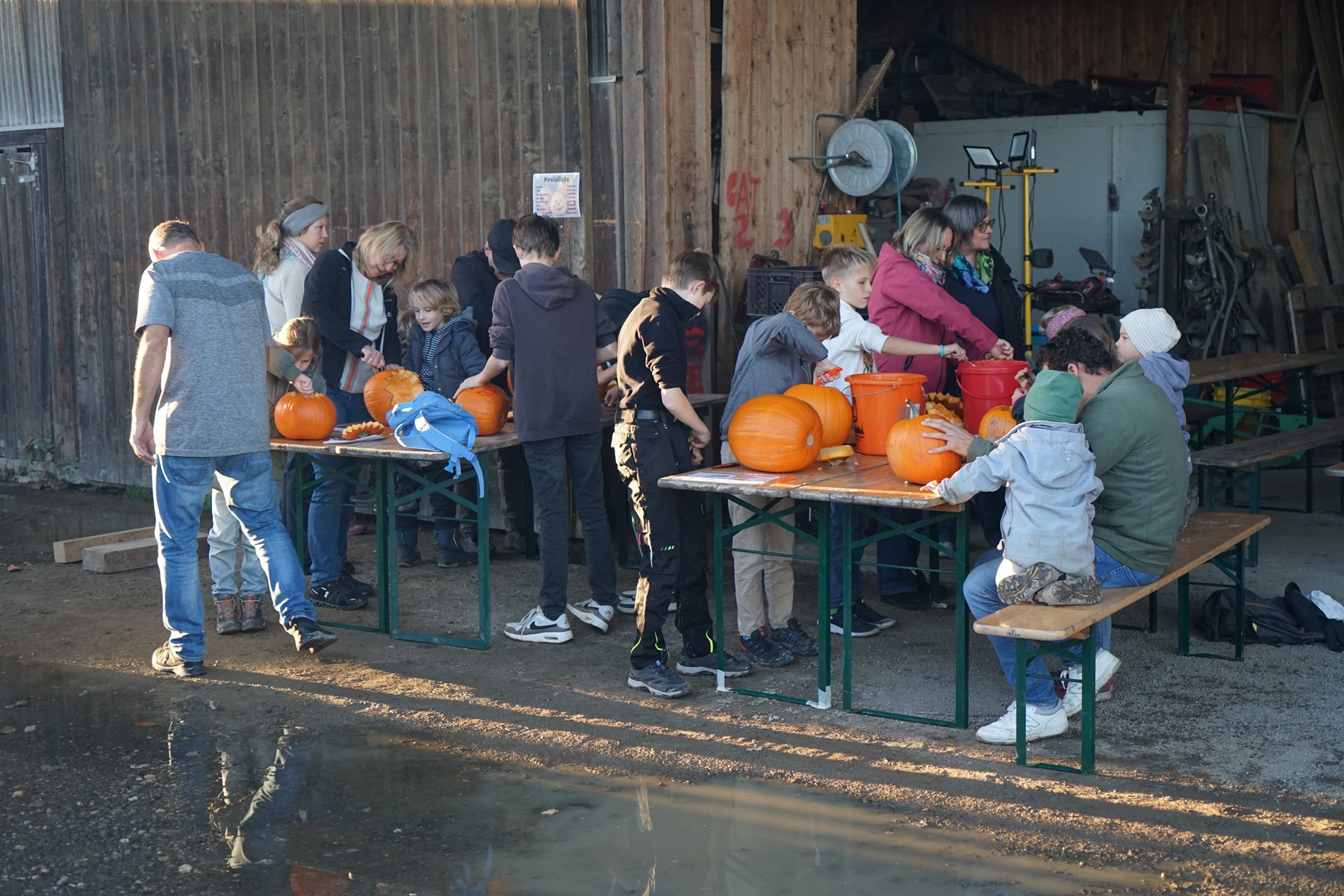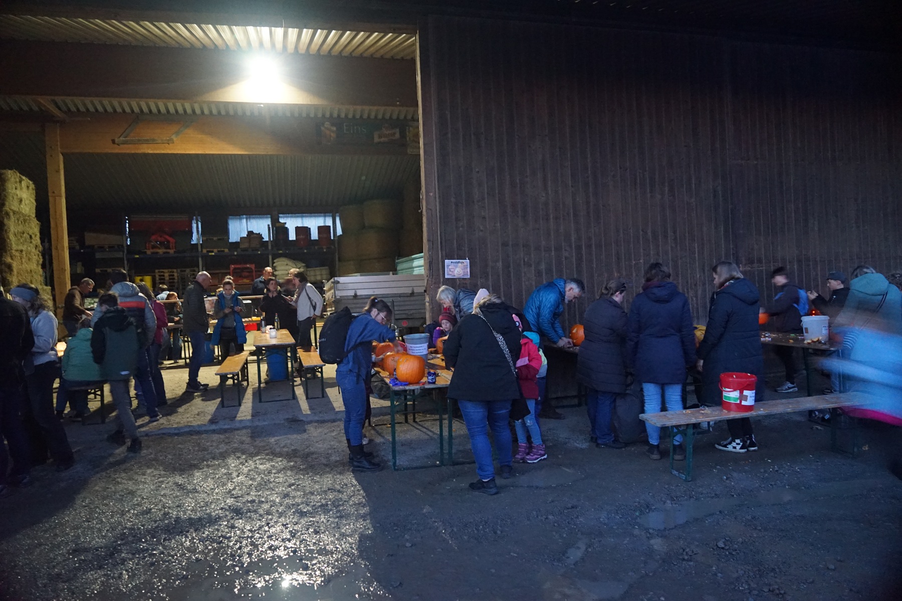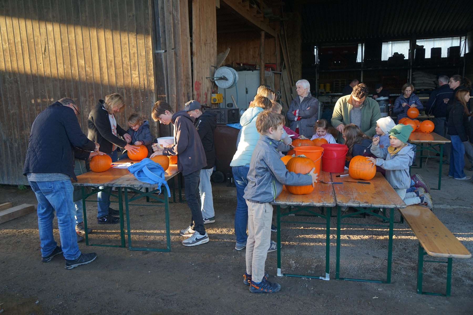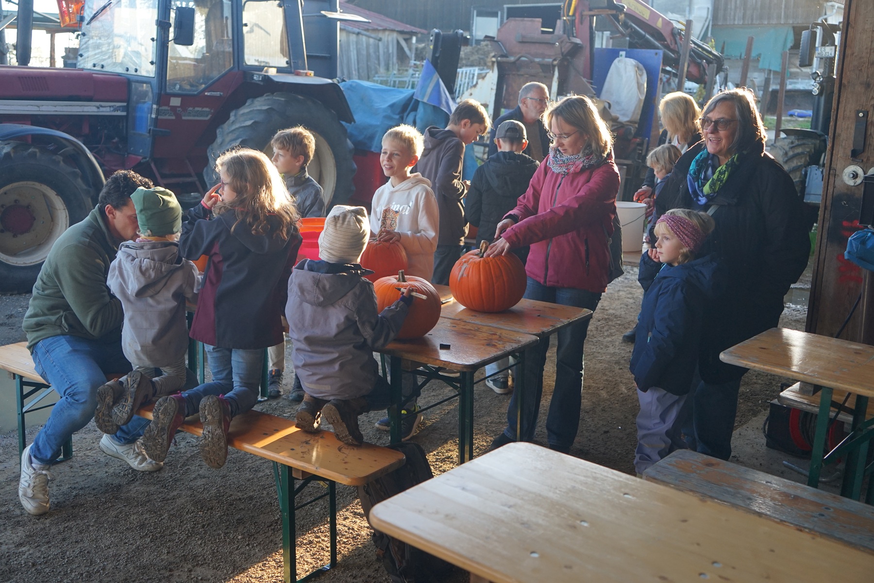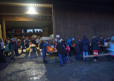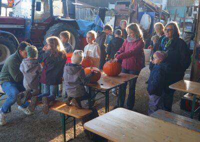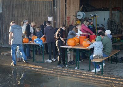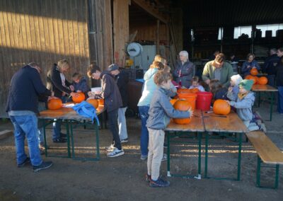 Gut 90 Kinder tummelten sich dann mit ihren Eltern oder Großeltern vor der Maschinenhalle des Neuwieshofes Fetzer. An den Tischen waren alle Kids mit Feuereifer dabei, aus den Kürbissen gruselige Kürbisgeister zu schnitzen. Bei den riesigen Kürbissen mussten dann die Väter oder Mütter aushelfen, schließlich ist es nicht ganz so einfach die harte Schale der Kürbisse aufzubrechen und dann auszuhöhlen.