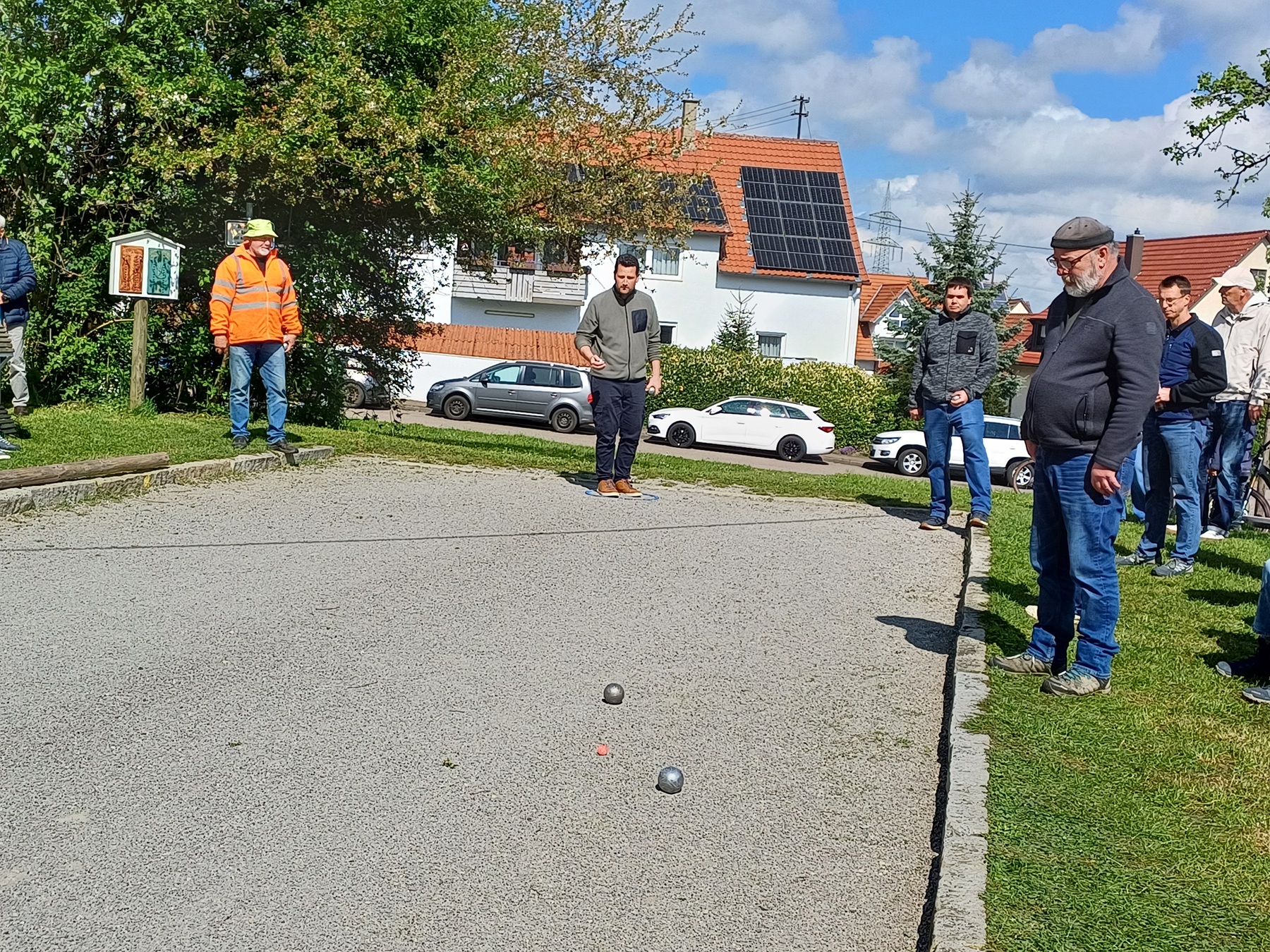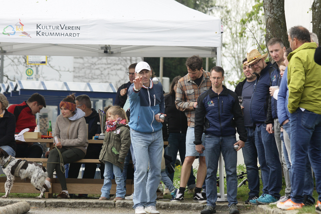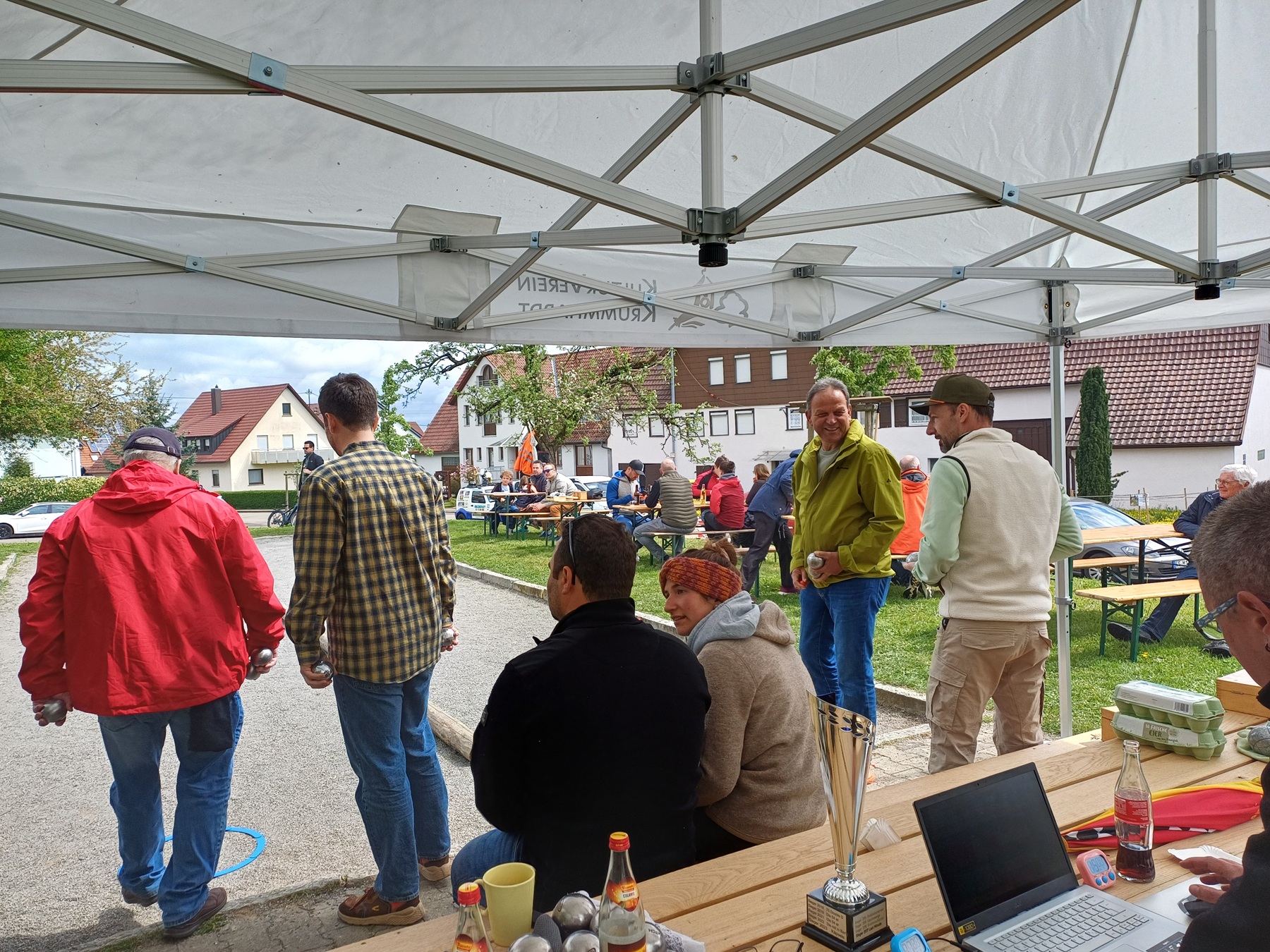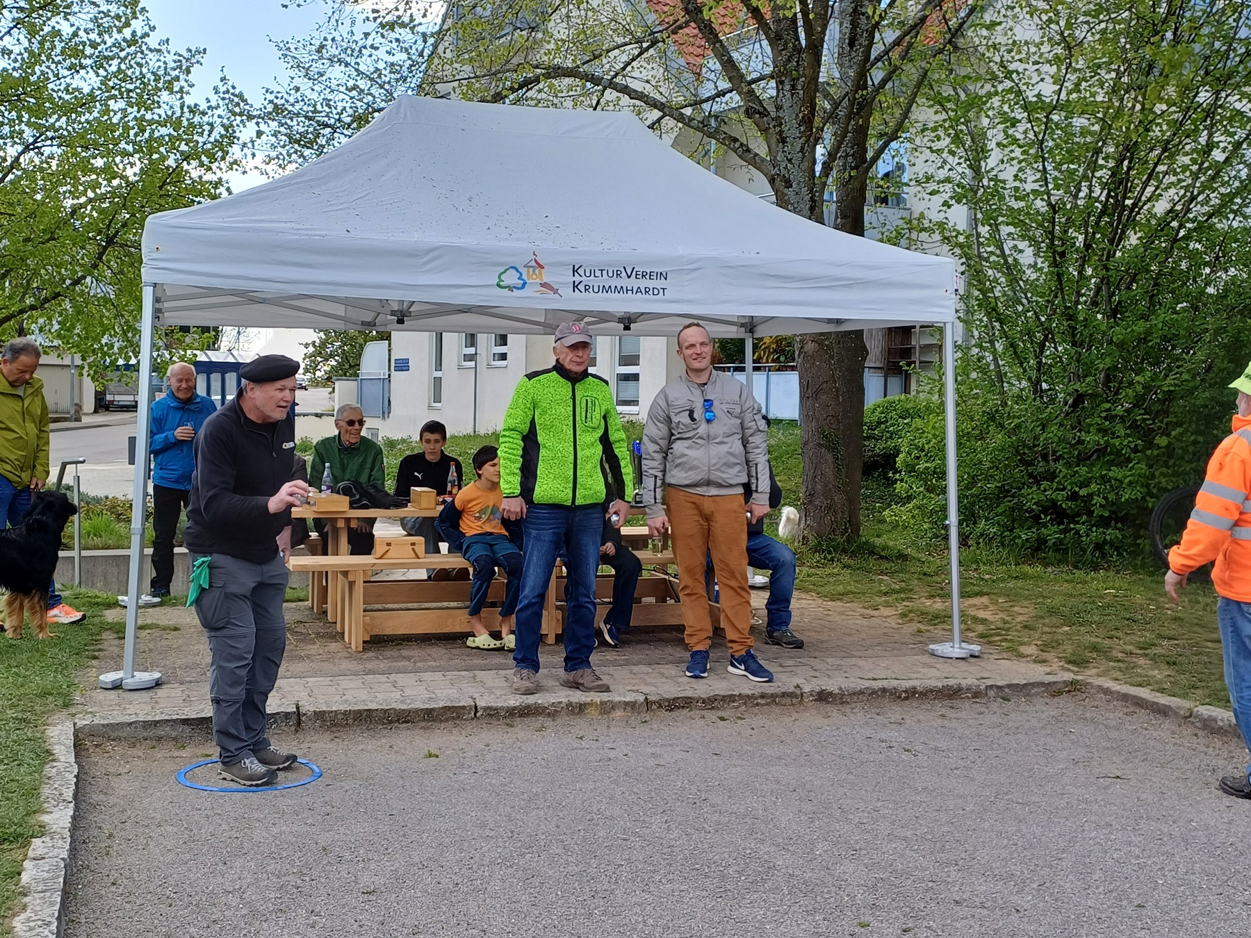 15 Amateurteams gingen beim Bouleturnier des Kulturvereins Krummhardt wieder an den Start. Die kleine aber feine Veranstaltung ist mittlerweile aus dem Veranstaltungskalender des Vereins nicht mehr wegzudenken, birgt es nicht nur viel Spaß, Spannung und gute Unterhaltung durch die Spiele, sondern auch ein entspanntes Zusammensein bei der Hocketse an der Boulebahn im Ortszentrum. Jürgen Zeiträg, der erste Vorstand des Vereins, begrüßte die motivierten Teams, und nach der Auslosung konnte es mit der Vorrunde losgehen. Gespielt wurde im 15-Minuten-Modus bzw. wer zuerst 9 Punkte erzielt. Die Vorrunde mit insgesamt 30 Spielpaarungen ging nach etwa vier Stunden und vielen spannenden Begegnungen zu Ende und die sechs Mannschaften für die Zwischenrunde standen fest. In der Gruppe A qualifizierten sich mit je drei Siegen die Teams „Die 54er“ (Manfred Seifried / Horst Schäfer) und „Kugelblitze“ (Simon Schäfer / Moritz Dung). „Rauschkugla“ (Uwe Spengler / Michael Weber) fuhren in der Gruppe B ebenso wie „Die mit `m Bart“ (Hans Hallwachs / Stefan „Ursus“ Maier) drei Siege ein und kamen somit in die Zwischenrunde. Dem Team „Lahme Enten“ (Dieter Unrath / Hubert Kiesel) aus Gruppe C reichten zwei Siege und ein Unentschieden, um als Gruppensieger weiterzukommen. Gruppenzweiter wurde „Balls of Steel“ (Michael Hallwachs / Markus Görisch). In Gruppe 1 der Zwischenrunde, die ebenfalls auf 9 Punkte bzw. auf 15-Minuten-Zeit gespielt wurde, verbuchte das Team „Rauschkugla“ zwei klare Siege und sicherten sich den Einzug ins Finale. Mit einem Sieg und einer Niederlage landete das Team „Kugelblitze“ auf Platz 2. In der Gruppe 2 lief es analog der Gruppe 1. 2 Siege des Teams „Die 54er“ katapultierten diese ins Endspiel. Ein Sieg reichte Hans Hallwachs und Ursus Maier („Die mit `m Bart“), um ins „kleine Finale“ – sprich Spiel um Platz 3 – einzuziehen. Beim Spiel um Platz 3 wurde auf dem gesamten Platz und bis 13 Siegpunkte gespielt, ohne Zeitlimit. Den Vorsprung der „Kugelblitze“ konnten „Die mit `m Bart“ trotz zahlreicher guter Würfe am Ende nicht mehr einholen und so sicherten sich Simon Schäfer und Moritz Dung den Platz auf dem Siegerpodest. In der Finalpaarung ging es sehr spannend zu. Immer wieder kamen Manfred Seifried und Horst Schäfer dem Team „Rauschkugla“ näher, doch am Ende reichte es mit 13:10 für Uwe Spengler und Michael Weber zum Sieg. Alle Siegerteams erhielten eine Urkunde mit Geschenk und präsentierten sich am Ende fröhlich der Fotografin für ein Siegerfoto. Ein herzliches Dankeschön gilt allen fleißigen Helfern rund um das Turnier, allen Kuchenbäcker/innen und dem Turnierleiter Steffen Wahr.